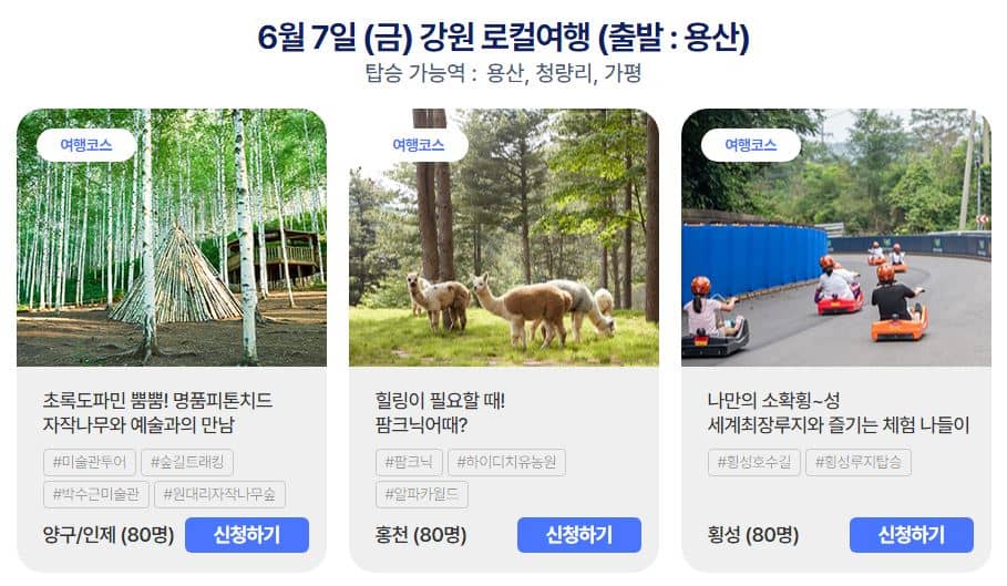 "6월엔 여기로" 이벤트는 1인당 참가비 4만 9천 원 이외의 일체의 여행 경비를 지원받는 혜택으로 지난 3월에도 경쟁률이 치열했던 혜택입니다. 가족여행으로 6월 당일치기 기차여행이 계획 중이시면 이번 이벤트 혜택을 놓치지 말고 기간 내에 신청하시기 바랍니다.