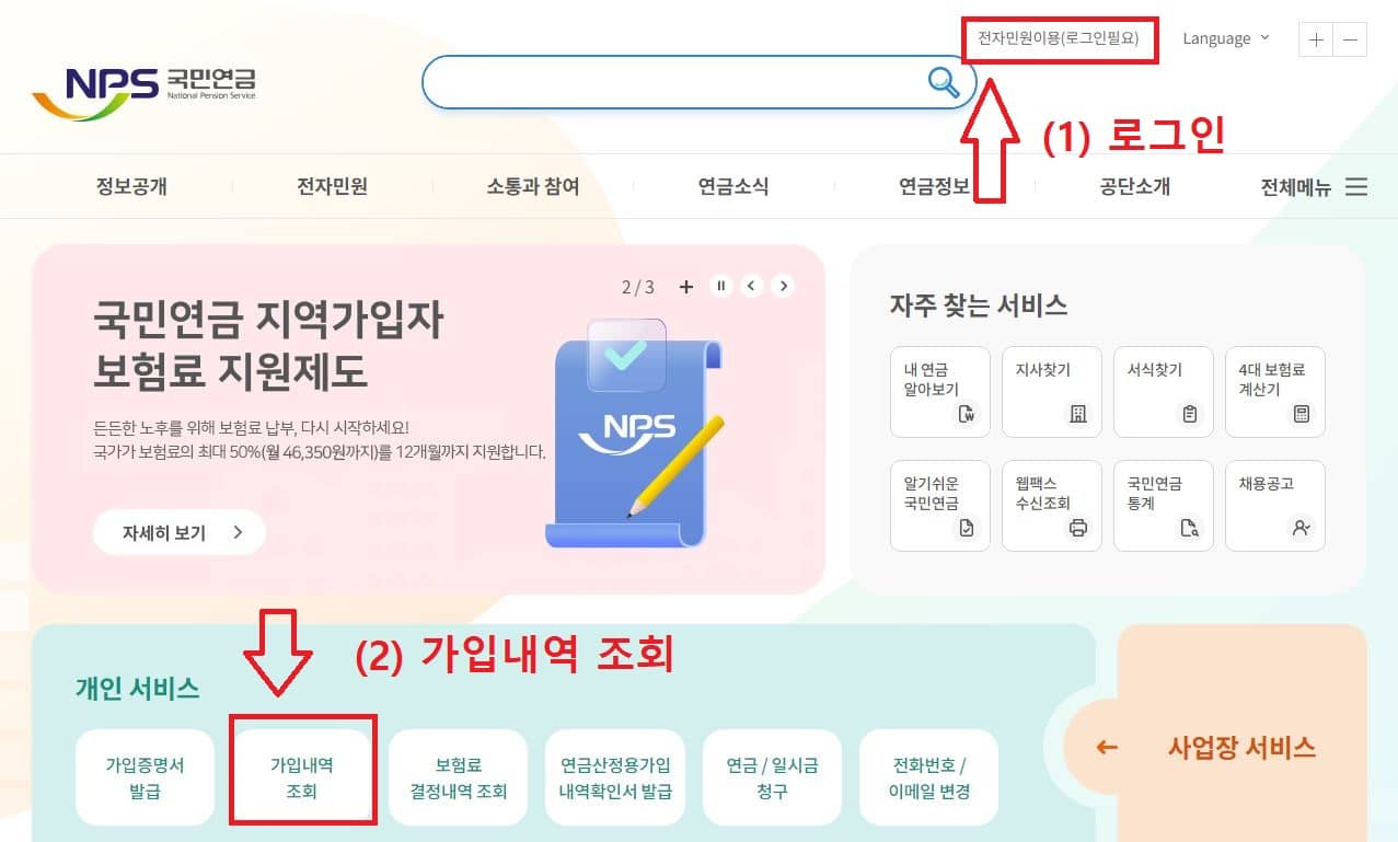 국민연금 홈페이지 접속 > 오른쪽 상단 로그인 > 가입내역 조회