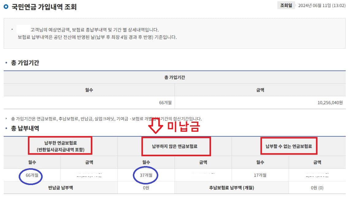 - 국민연금 가입 내역 조회 화면에서 "총 납부내역" 메뉴를 중 "납부하지 않은 연금보험료"에 해당하는 금액이 미납금에 해당하는 금액으로, 총 37개월 분의 국민연금이 미납되어 있음을 확인할 수 있습니다.