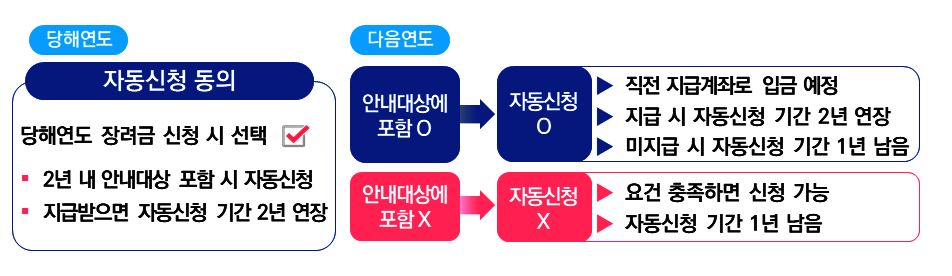 자동신청에 동의하더라도 향후 2년 내에 장려금 신청 안내 대상에 포함되지 않으면 기존 자동신청 동의 효과는 소멸됩니다. 다만 동의 신청 효과가 소멸된 이후에 장려금 신청 안내 대상에 포함되면 다시 자동신청에 동의하실 수 있습니다.
