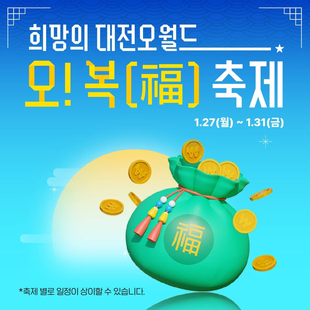 27일이 임시공휴일로 지정되면서 이번 설 연휴가 6일로 늘어났습니다. 대전지역에서 설날을 맞이하여 다양한 행사가 열리는데 오늘 포스팅에서는 설을 맞이하여 오월드에서 열리는 오! 복축제에 대하여 축제 기간, 시간표, 축제 이벤트에 대하여 자세하게 알아보겠습니다.