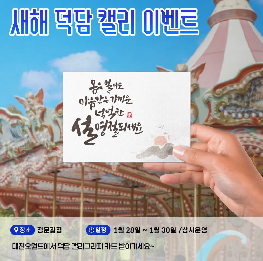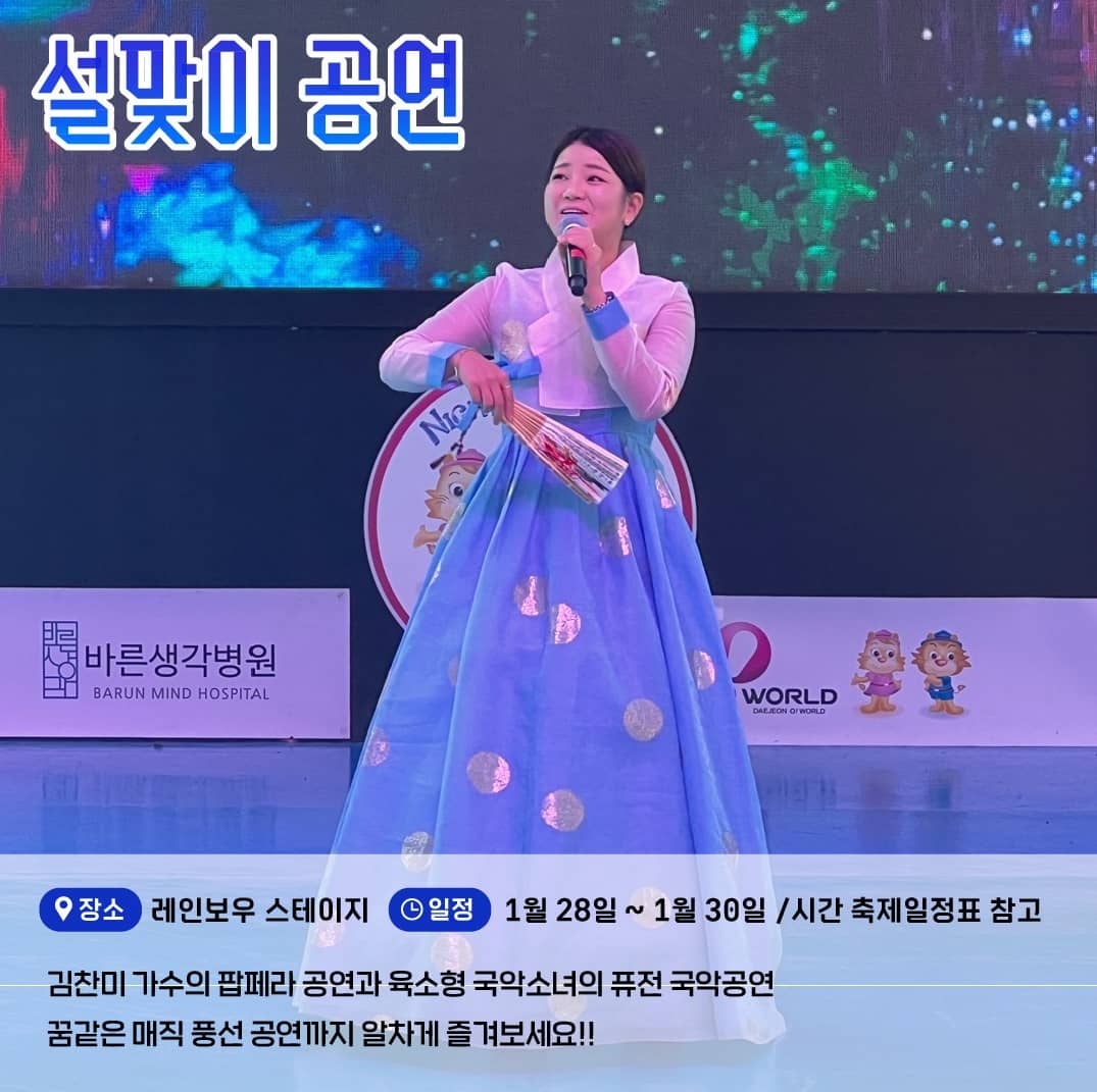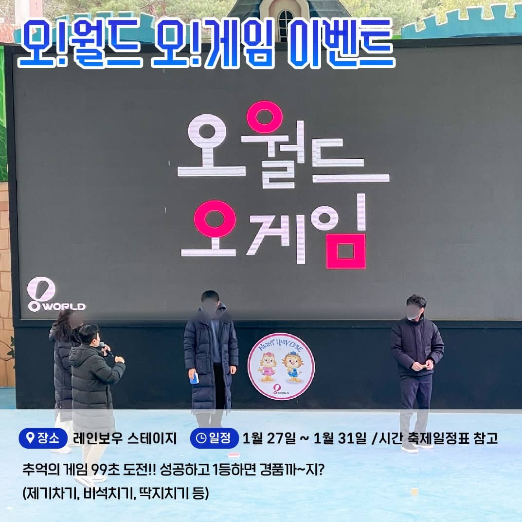 이번 설을 맞이하여 오월드에서는 1월 15일부터 31일까지 설맞이 다양한 이벤트가 진행됩니다. 시간별 다양한 공연과 포토타임, 시민참여 행사까지 다양하게 마련되어 있습니다.