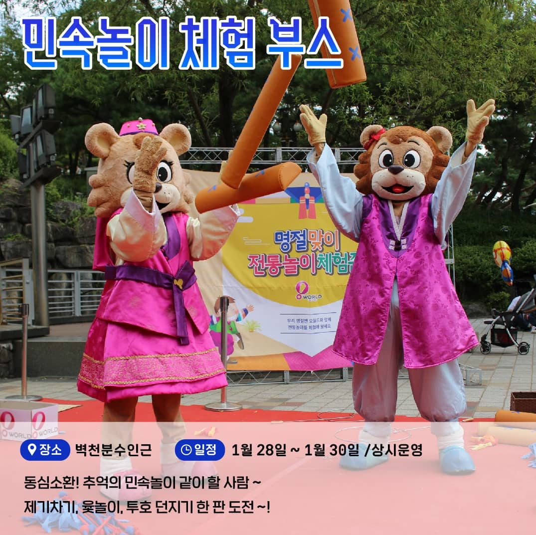 제기차기, 윷놀이, 투호 던지기 등 시민들이 참여하는 다양한 민속놀이를 체험할 수 있습니다. 체험부스는 1월 28일부터 30일까지 벽천분수 인근에서 상시로 운영됩니다.