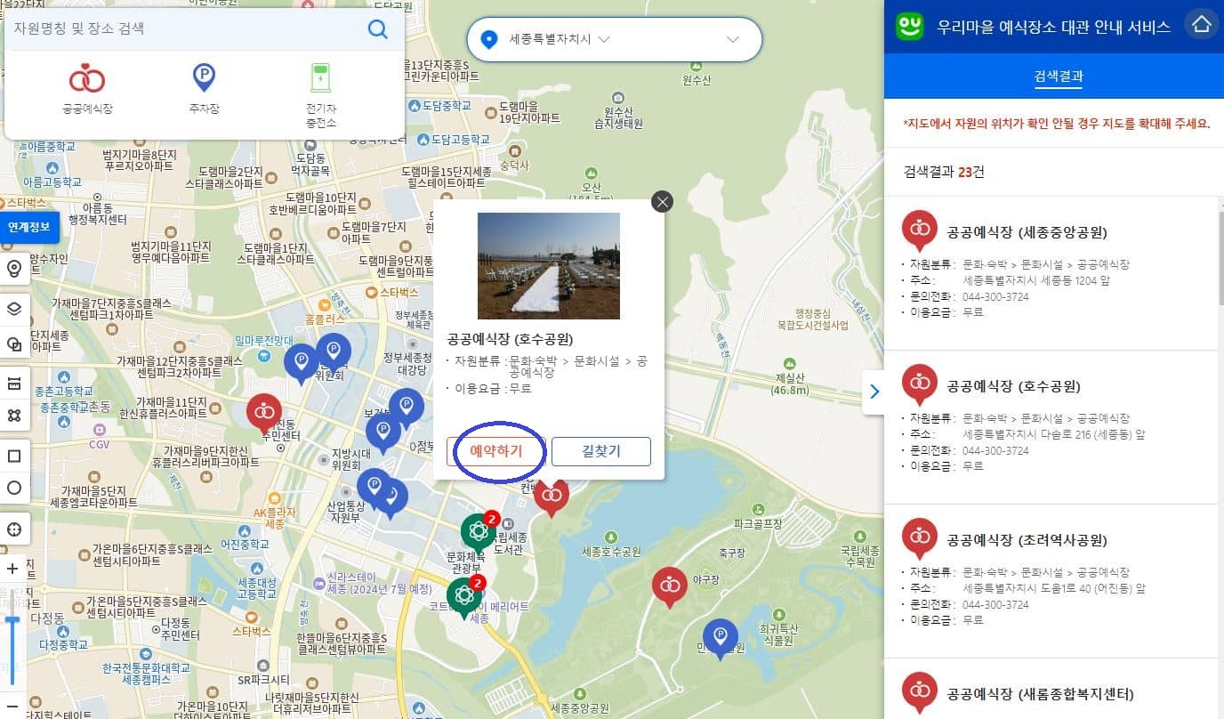 해당 지도에서는 공공예식장과 함께 근처의 주차장과 전기차 충전소에 대한 정보도 함께 보실 수 있습니다. 해당 지역의 지도를 크게 확장한 후 공공예식장 아이콘을 클릭하면 이용 요금과 함께 예약할 수 있는 페이지로 이동할 수 있는 버튼이 나옵니다.