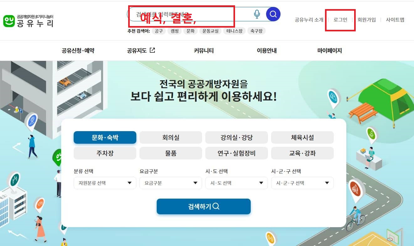 공유누리 홈페이지에 접속하여, 상단의 검색창에 "예식" 또는 "결혼"등의 검색어를 넣고 검색하면, 전국에서 예식장으로 이용가능한 공공시설들의 목록 리스트가 검색됩니다.