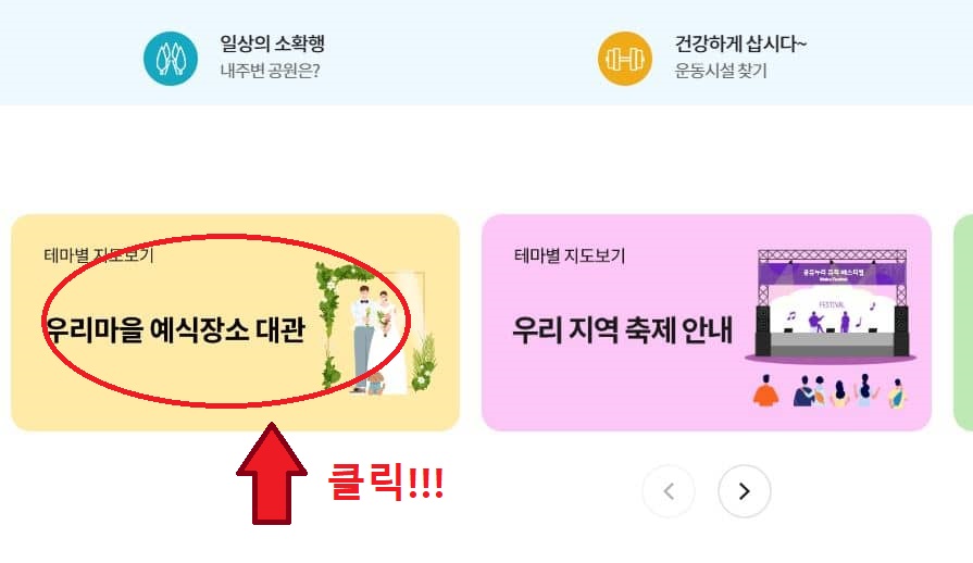 만약 검색을 하지 않으신다면, 홈페이지의 첫 페이지 아랫부분의 배너로 제공되는 "우리 마을 예식장소 대관"을 클릭하시면 지도에서 해당 지역의 예식장을 검색할 수 있습니다.