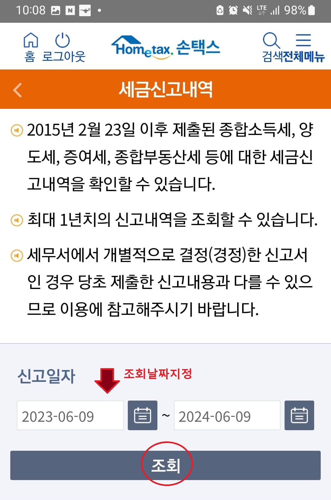 종합소득세 환급금 조회는 모바일 탭인 손택스의 "세금신고내역조회"에서도 확인이 가능합니다.