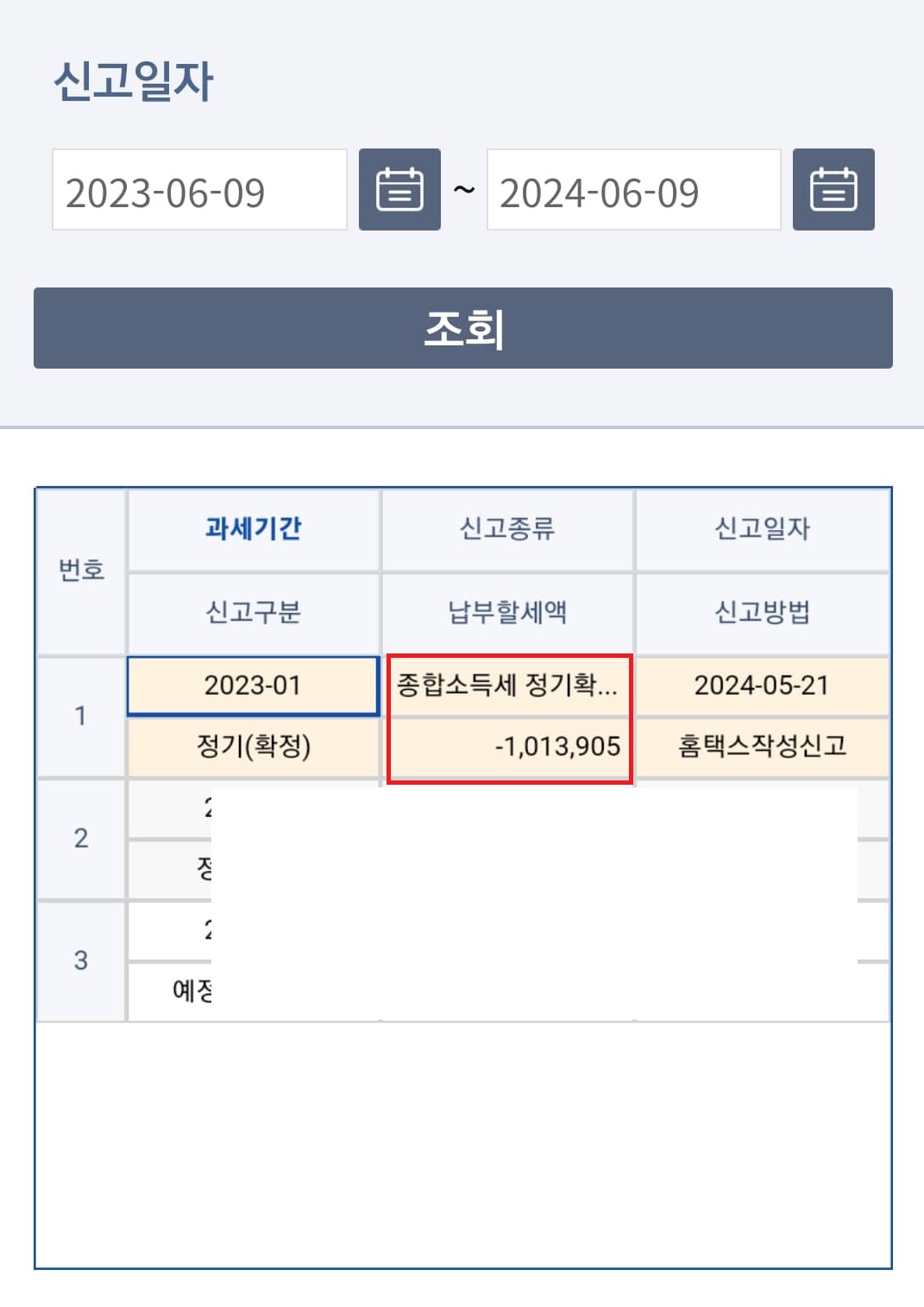 → 올해 2024년 5월 21일에 종합소득세를 신고하였고, 납부할 세액이 (-1,13,905원)으로 금액 앞이 "-"로 환급금이 " 1,13,905원"이라는 것을 확인할 수 있습니다.