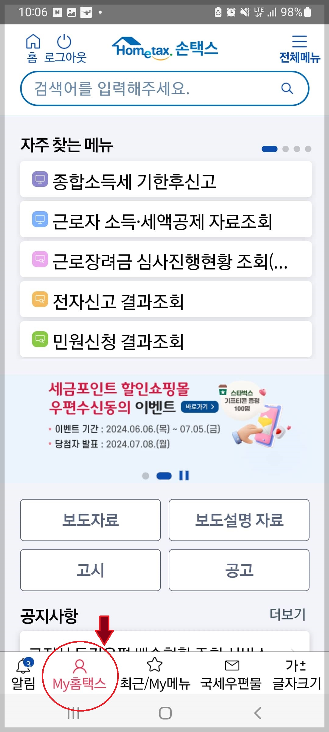 손택스 앱을 실행하여 로그인 후 왼쪽 하단의 My홈택스 메뉴에 들어갑니다.
