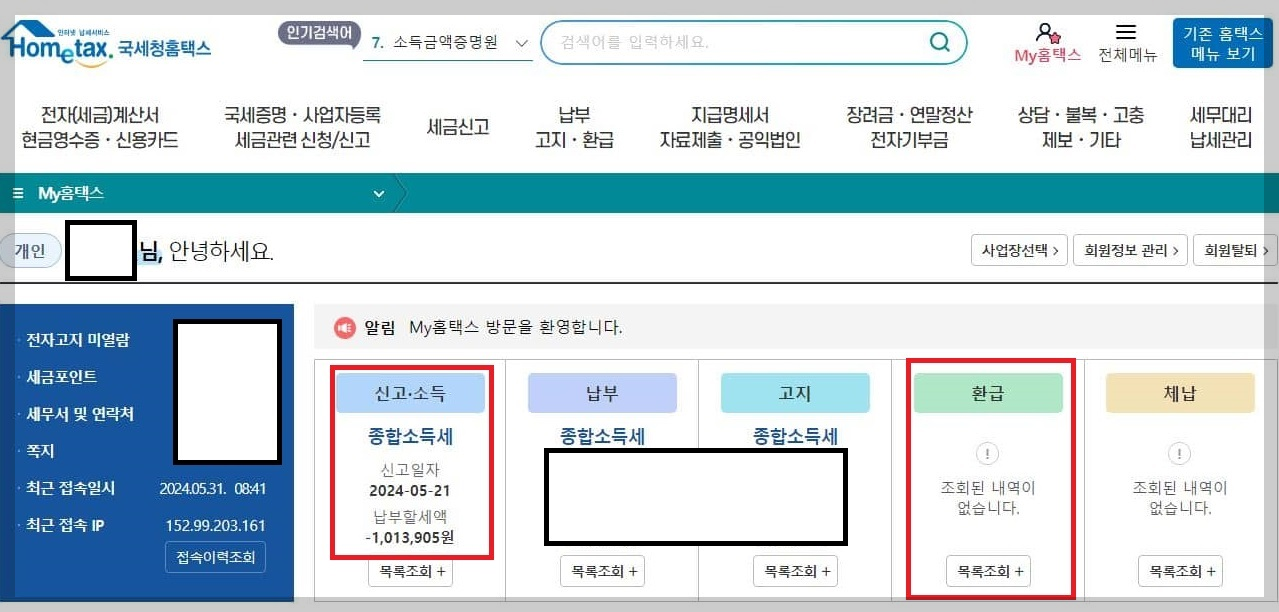 종합소득세 환급금 확인하기