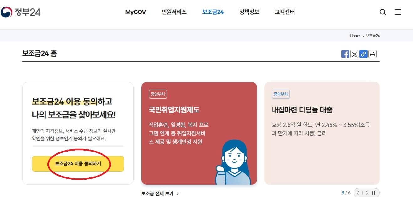 만약 보조금 24 사용이 처음이시라면, 처음에는 개인정보 동의 과정을 거치셔야 합니다. 로그인하면 "보조금 24 이용 동의하기" 버튼이 나오고, 해당 버튼을 누르셔서 개인정보 활용에 동의하시면 됩니다.