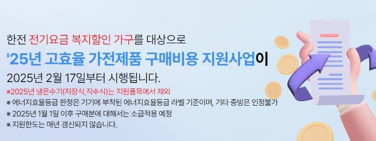 오늘 포스팅에서는 2025년 한전 고효율 가전제품 구입비용 지원사업 개요와 더불어 가입 대상자, 가입품목, 혜택 신청방법, 구비서류와 더불어 자주 묻는 질문까지 완벽하고 꼼꼼하게 정리해 보도록 하겠습니다. 특히 지원금 신청 시 자주 발생하는 오류와 놓치기 쉬운 준비서류까지 꼼꼼히 정리했으니 참고하시기 바랍니다.