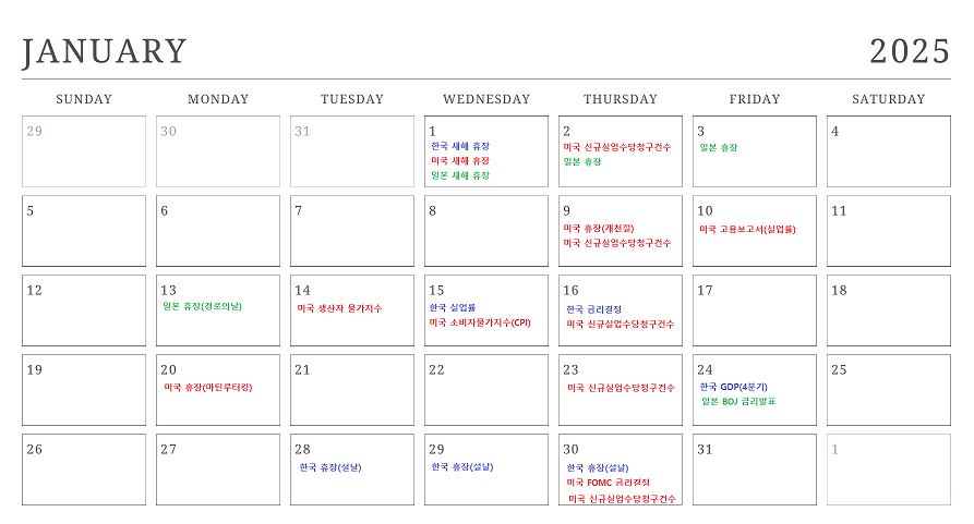 이번 글에서는 2025년 1월 한 달간 한국, 미국, 일본의 주요 금리결정, 주요 경제지표 발표일과 휴장일에 대하여 상세히 정리해 드리고, 한눈에 볼 수 있는 한국, 미국, 일본 주요 이벤트 달력 파일까지 다운로드하셔서 투자에 활용해 보시길 바랍니다.