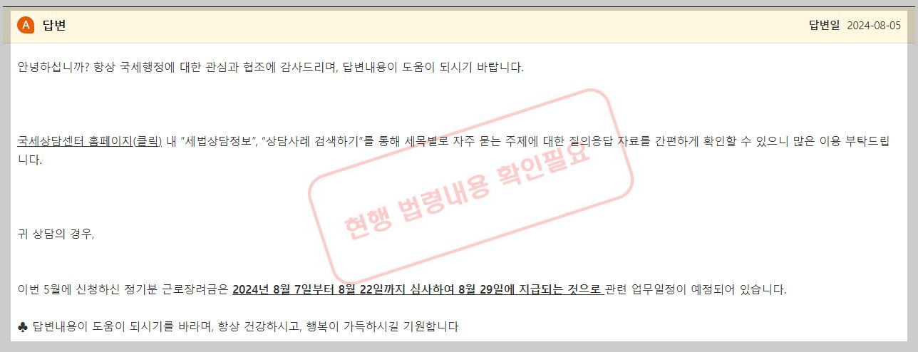 그럼 2024년 근로장려금 정기분은 언제 입금이 될까요? 국세청에 질의하고 답변한 결과 8월 7일부터 22일까지 근로장려금 심사를 진행하여 8월 29일에 지급되는 것으로 업무 일정이 예정되어 있다고 합니다.