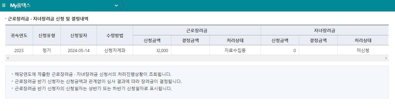 My홈택스 > 소득자료/장려금/학자금상환 > 근로/자녀장려금 신청 및 결정 메뉴 내에서 확인하실 수 있습니다.