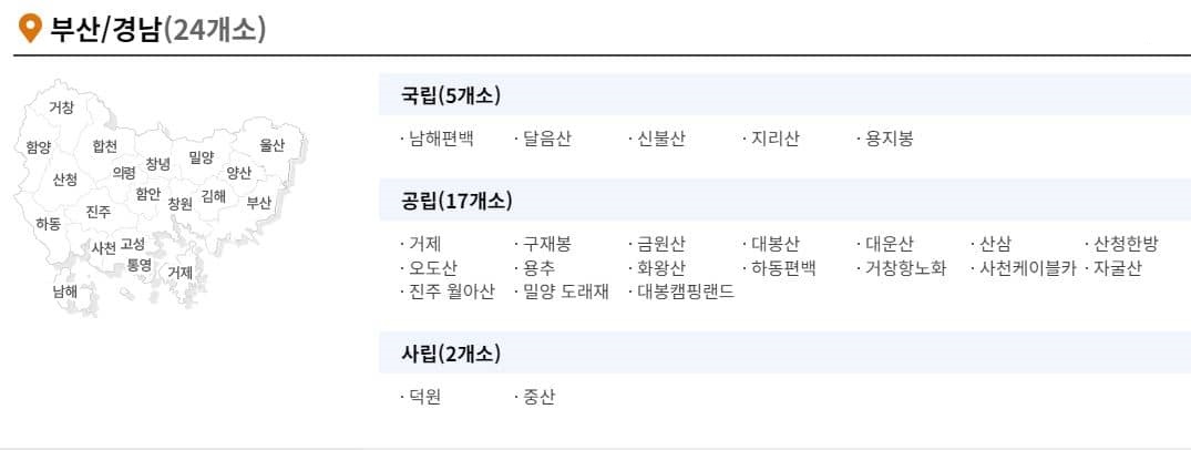 | 부산/경남 | 남해편백, 달음산, 신불산, 지리산, 용지봉 |