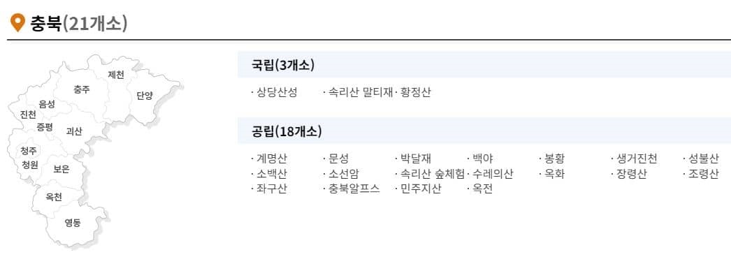 | 충북 | 상당산성, 속리산 말티재(황정산) |