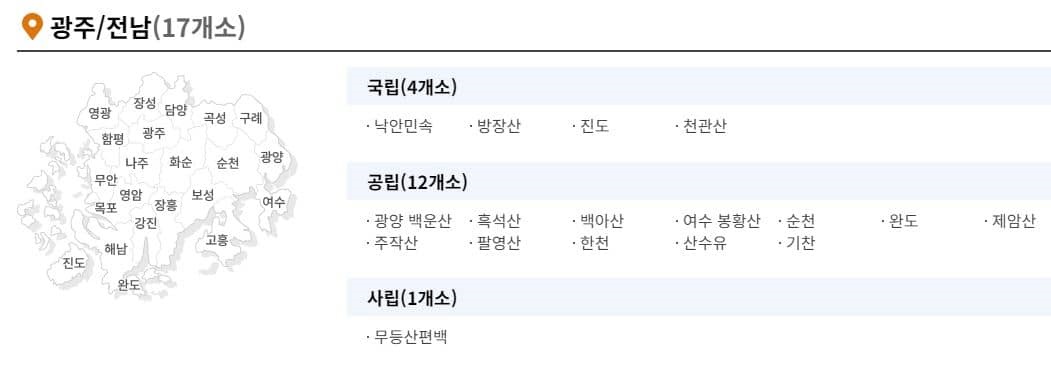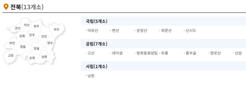 | 전북 | 덕유산, 변산, 운장산, 회문산, 신시도 |