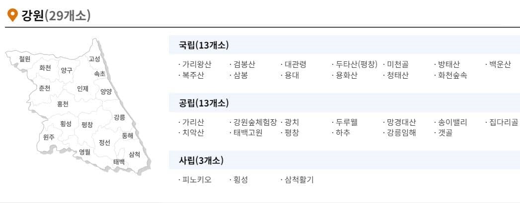 | 강원 | 가리왕산, 검봉산, 대관령, 두타산(평창), 미천골, 방태산, 백운산, 복주산, 삼봉, 용대, 용화산, 청태산, 화천숲속 |