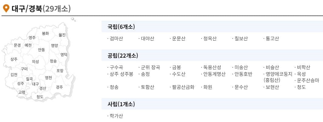 | 대구/경북 | 검마산, 대야산, 운문산, 청옥산, 칠보산, 통고산 |