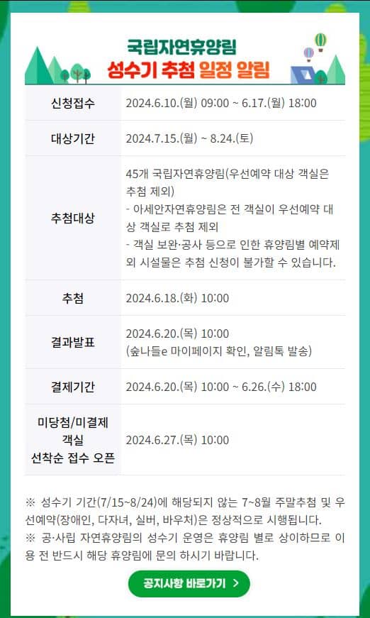 2024년 국립자연휴양림 성수기(2024년 7월 15일(월) ~ 8월 24일(토) ) 전국의 45개 국립자연휴양림(우선예약 대상 객실은 추첨에서 제외됨) 이용에 대해 "추첨방식"으로 이루어 집니다.