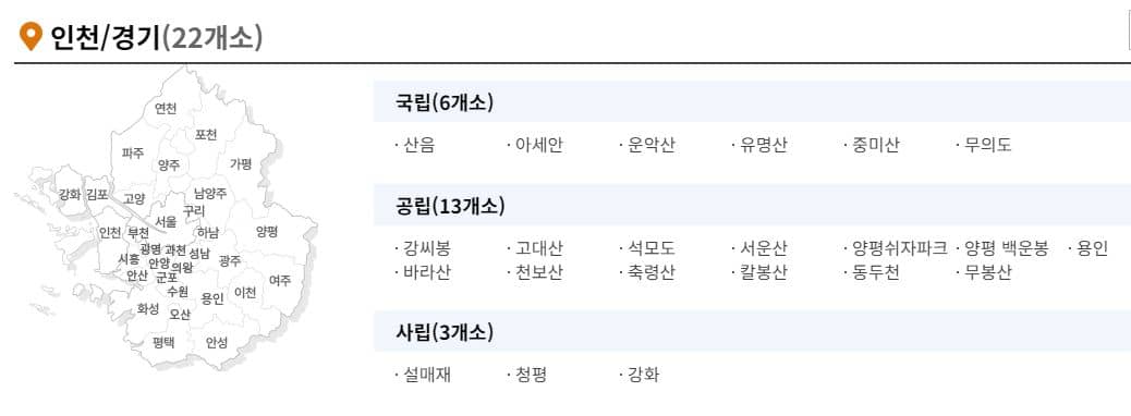 | 인천/경기 | 산음, 아세안, 운악산, 유명산, 중미산, 무의도 |