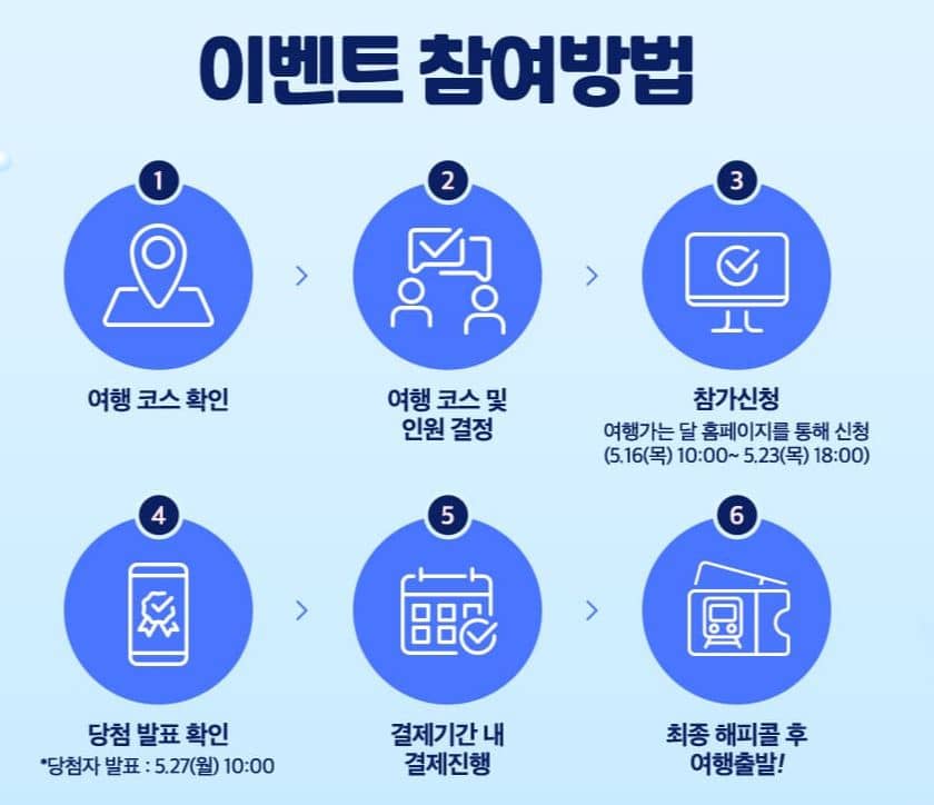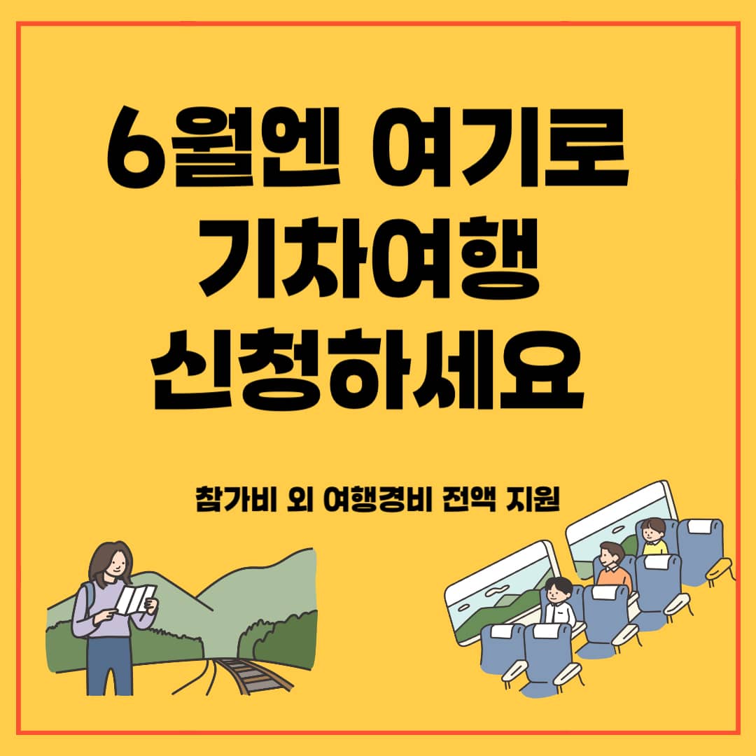 "6월엔 여기로" 이벤트는 1인당 참가비 4만 9천 원 이외의 일체의 여행 경비를 지원받는 혜택으로 지난 3월에도 경쟁률이 치열했던 혜택입니다. 가족여행으로 6월 당일치기 기차여행이 계획 중이시면 이번 이벤트 혜택을 놓치지 말고 기간 내에 신청하시기 바랍니다.