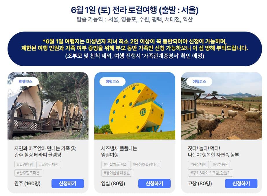 6월 1일 여행지는 "다자녀가구 이벤트"로 진행되는 것으로 미성년자 자녀 2명 이상이 꼭 동반되어야 신청이 가능하며, 부모 동반 가족만 신청이 가능합니다.